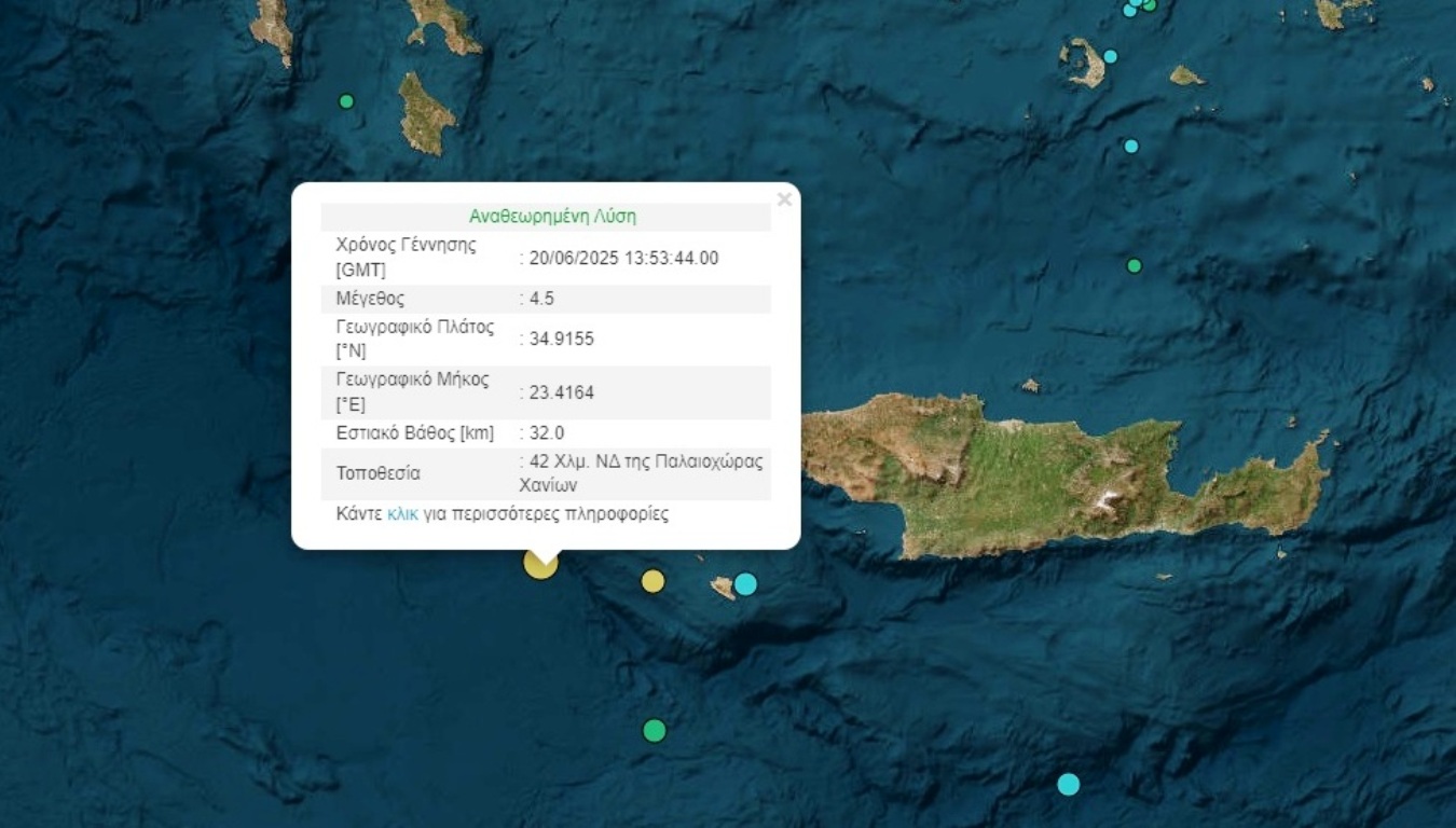 Ο σεισμός σημειώθηκε στις 16:53 σύμφωνα με το Γεωδυναμικό Ινστιτούτο Αθηνών, με επίκεντρο θαλάσσια περιοχή 47χλμ νοτιοδυτικά της Παλαιοχώρας Χανίων.