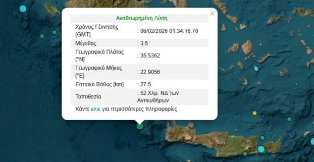 Η σεισμική δόνηση σύμφωνα με την αναθεωρημένη λύση Γεωδυναμικού Ινστιτούτου του Αστεροσκοπείου Αθηνών καταγράφθηκε στις 03:34 με επίκεντρο τη δόνησης εντοπίζεται στα 52 χλμ. νοτιοδυτικά των Αντικυθήρων.