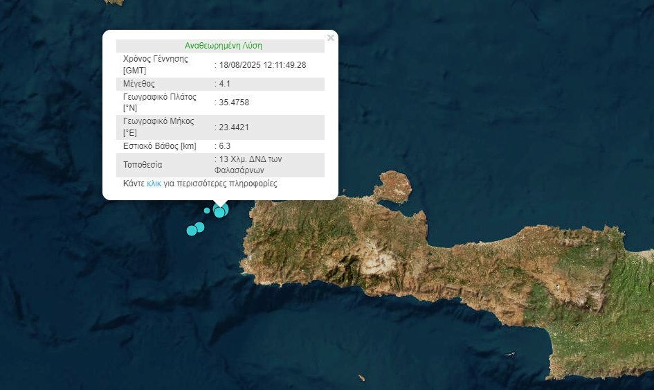 Σεισμική δόνηση με μέγεθος 4,1 βαθμών της κλίμακας Ρίχτερ σημειώθηκε στις 15:11 στα Χανιά.