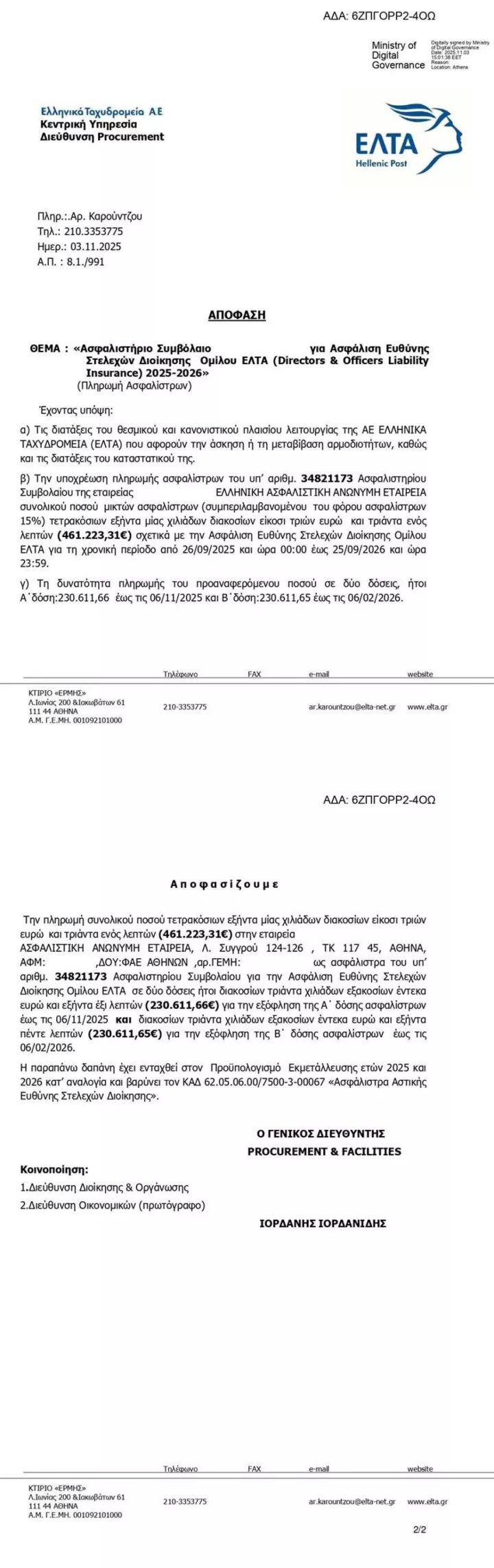 2. Η απόφαση για την ανανέωση/σύναψη του νέου ασφαλιστηρίου ελήφθη τον Σεπτέμβριο του 2025, στο πλαίσιο της πάγιας εταιρικής πρακτικής και βάσει των προβλεπόμενων διαδικασιών. Η σύμβαση υπεγράφη μετά την ολοκλήρωση της αναλυτικής αξιολόγησης των προσφορών.