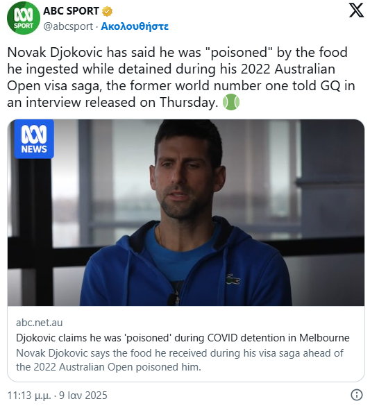 Ο Νόβακ Τζόκοβιτς κατήγγειλε πως το 2022 τον δηλητηρίασαν, όταν είχε ταξιδέψει στην Αυστραλία για το Grand Slam, αλλά έμεινε υπό περιορισμό επειδή αρνείτο να κάνει εμβόλιο κατά του κορωνοϊού και κατόπιν απελάθηκε.