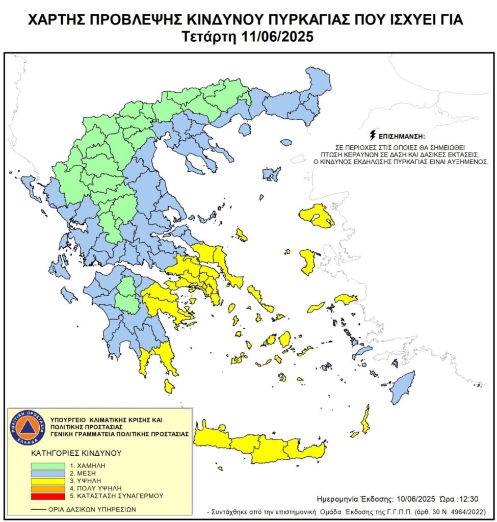 Σημειώνεται ότι αυξημένος κίνδυνος (κατηγορία κινδύνου 3) για την εκδήλωση φωτιάς σε 17 περιοχές όλης της χώρας υπάρχει για αύριο Τετάρτη (10.6.2025), σύμφωνα με τον Χάρτη Πρόβλεψης Κινδύνου Πυρκαγιάς που εξέδωσε η ΓΓ Πολιτικής Προστασίας.