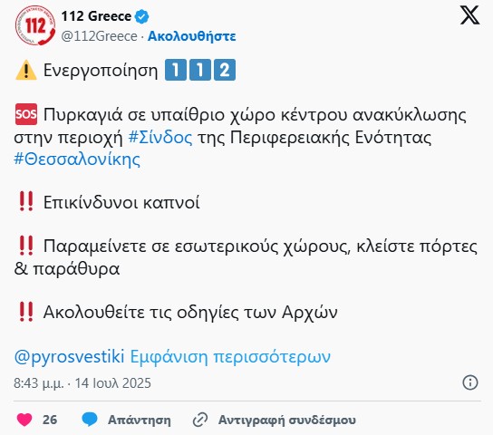 Μάλιστα εστάλη μήνυμα 112 λόγω των επικίνδυνων καπνών που εκλύονται στην ατμόσφαιρα από την πυρκαγιά, συνιστώντας στους κατοίκους της περιοχής να παραμείνουν σε κλειστούς χώρους, να κλείσουν πόρτες και παράθυρα και να ακολουθούν τις οδηγίες των Αρχών.