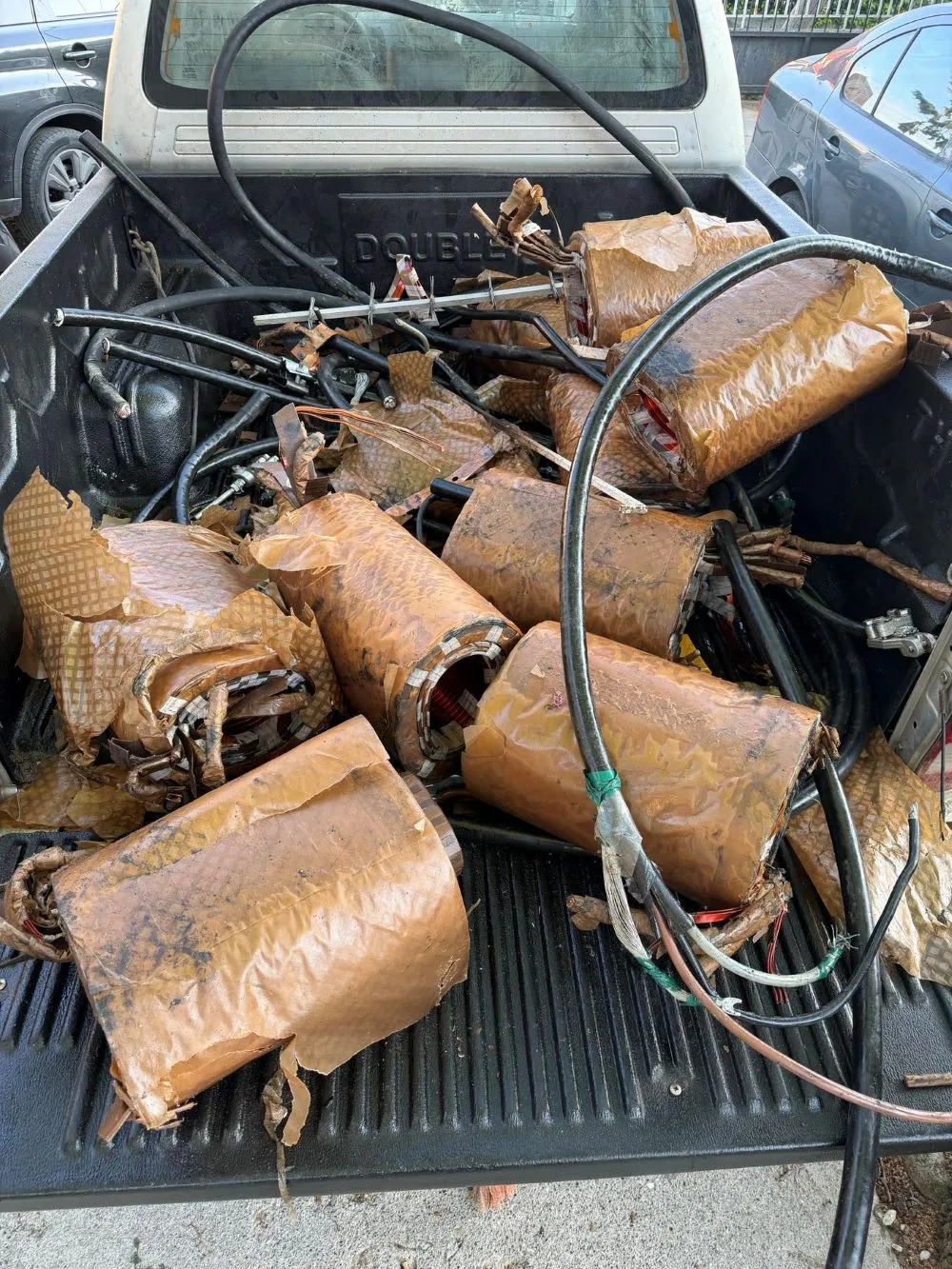 Στην καρότσα του οχήματος, για το οποίο είχε δηλωθεί κλοπή τις προηγούμενες ημέρες στο Α.Τ. Βόλβης, βρέθηκαν και κατασχέθηκαν (9) πηνία χαλκού, που αφαιρέθηκαν από (3) ισάριθμους μετασχηματιστές καθώς και πλήθος εργαλείων, που χρησιμοποιούνται για την αφαίρεση μετασχηματιστών.