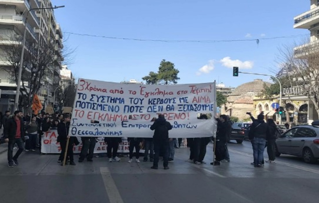 Σε εξέλιξη η πορεία μαθητών και φοιτητών στο κέντρο της Θεσσαλονίκης, με αφορμή την συμπλήρωση τριών ετών από το σιδηροδρομικό δυστύχημα στα Τέμπη, στο οποίο έχασαν την ζωή τους 57 αθώες ψυχές.