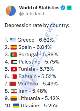 Η Ελλάδα του Μητσοτάκη πήρε για άλλη μια φορά ανεπιθύμητη πρώτη θέση, αυτή την φορά κατατάσσεται στην κορυφή παγκοσμίως ως προς το ποσοστό του πληθυσμού που πλήττεται από καταθλιπτικές διαταραχές, με εκτιμώμενο ποσοστό 6,5%, σύμφωνα με τα πιο πρόσφατα δεδομένα της μελέτης Global Burden of Disease του Institute for Health Metrics and Evaluation (IHME) για το 2023.