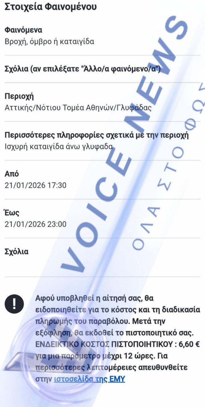 Αναγνώστης μας, θύμα της σφοδρής κακοκαιρίας που έπληξε την περιοχή της Άνω Γλυφάδας στις 21 Ιανουαρίου 2026, είδε την περιουσία του να καταστρέφεται. Το αυτοκίνητό του πλημμύρισε, με το νερό να προκαλεί σοβαρές ζημιές στο εσωτερικό του οχήματος. Όντας νομοταγής και προνοητικός, ο πολίτης είχε φροντίσει να έχει ασφάλεια για καιρικά φαινόμενα. Και εδώ ξεκινά ο παραλογισμός. Για να αποζημιωθεί από την ασφαλιστική του εταιρεία, χρειάζεται αυτονόητα μια βεβαίωση από την Εθνική Μετεωρολογική Υπηρεσία (ΕΜΥ) που να πιστοποιεί ότι, ναι, εκείνη την ημέρα έβρεξε καταρρακωδώς.