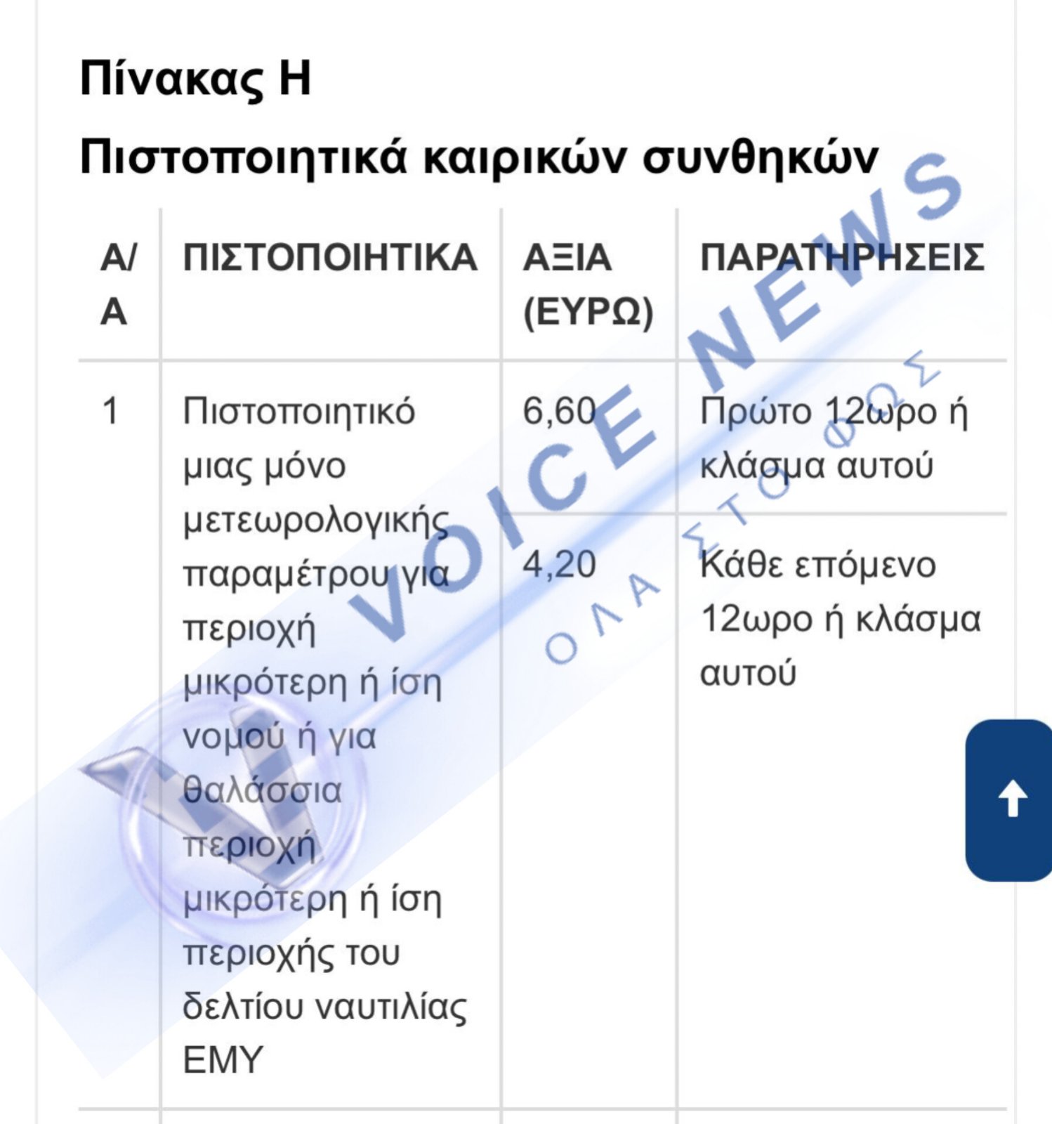 Όπως φαίνεται ξεκάθαρα και στον «Πίνακα Η» που φέρνουμε στη δημοσιότητα, η υπηρεσία χρεώνει 6,60 ευρώ για το Πιστοποιητικό μιας μόνο μετεωρολογικής παραμέτρου για το πρώτο 12ωρο!