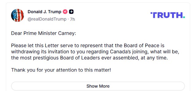 Σε ανάρτηση στο Truth Social, ο Τραμπ απευθύνθηκε στον Καναδό πρωθυπουργό Μαρκ Κάρνεϊ, γράφοντας ότι η αποσύρει επίσημα την πρόσκληση. Όπως τόνισε, το «Συμβούλιο Ειρήνης» θα αποτελέσει την πιο επιφανή ομάδα ηγετών που συγκεντρώθηκε ποτέ, αλλά η συμμετοχή του Καναδά δεν θα συμπεριληφθεί.