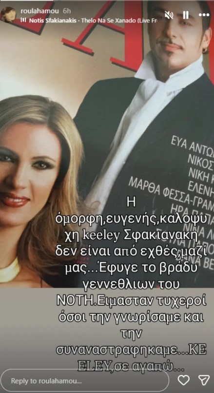 «Η όμορφη, ευγενής, καλοψυχή Keeley Σφακιανάκη δεν είναι από εχθές μαζί μας. Έφυγε το βράδυ γενεθλίων του Νότη. Ήμασταν τυχεροί όσοι τη γνωρίσαμε και τη συναναστραφήκαμε. Keeley, σε αγαπώ» έγραψε.
