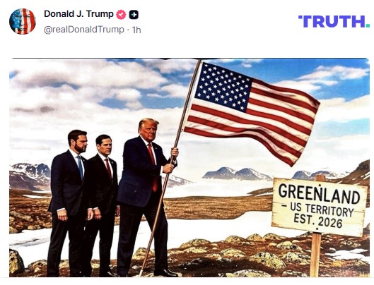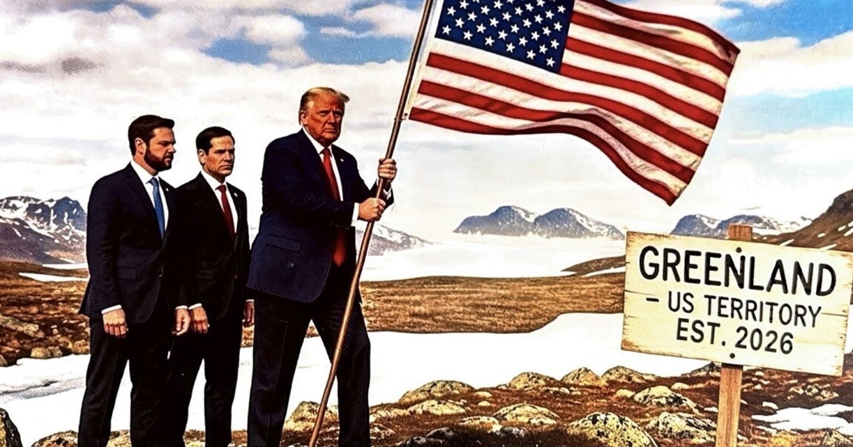 Στην AI φωτογραφία φαίνεται ο Τραμπ, ενώ από πίσω του ακολουθούν οι Τζέι Ντι Βανς και Μάρκο Ρούμπιο, να τοποθετεί μία αμερικανική σημαία και μία πινακίδα να γράφει: «Γροιλανδία: Έδαφος των ΗΠΑ από το 2026».
