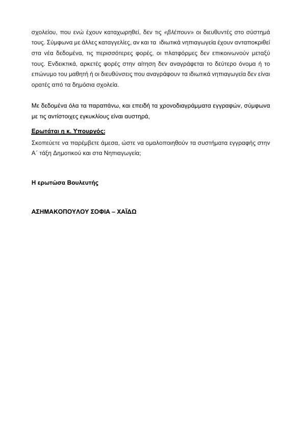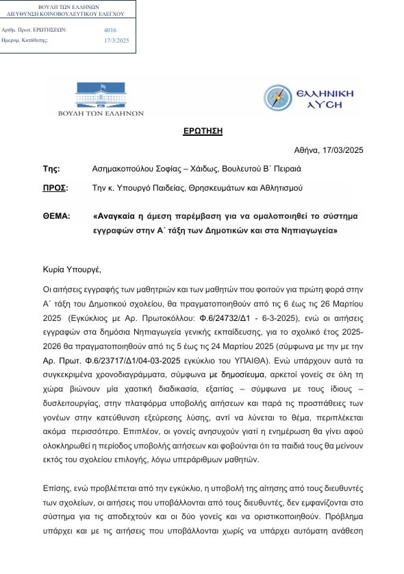 Σύμφωνα με επερώτηση που κατατέθηκε στη Βουλή από τη Βουλευτή της Ελληνικής Λύσης Σοφία-Χαϊδώ Ασημακοπούλου, η διαδικασία εγγραφών έχει μετατραπεί σε έναν γραφειοκρατικό λαβύρινθο, προκαλώντας ανησυχία και έντονο προβληματισμό στους γονείς. Παρά το γεγονός ότι τα χρονοδιαγράμματα είναι αυστηρά καθορισμένα – από τις 6 έως τις 26 Μαρτίου 2025 για την Α’ Δημοτικού και από τις 5 έως τις 24 Μαρτίου 2025 για τα Νηπιαγωγεία – οι δυσλειτουργίες του συστήματος καθιστούν την ολοκλήρωση της διαδικασίας ιδιαίτερα δύσκολη.