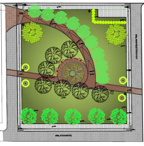Πρόκειται για ένα χώρο πρασίνου, που θα έχει στο κέντρο του ελικοειδή διαδρομή, διαστρωμένη με κυβόλιθους σε υδατοπερατό υπόστρωμα, η οποία έχει την κατάλληλη κλίση για την ασφαλή χρήση από αναπηρικό αμαξίδιο, και υπαγορεύεται από τη μεγάλη υψομετρική διαφορά που έχει ο χώρος, ανάμεσα στις οδούς Αιγυπτιάδη και Αταλάντης. Η διαδρομή αυτή οριοθετείται και στις δύο πλευρές της από τοιχία οπλισμένου σκυροδέματος, τα οποία λειτουργούν επικουρικά σαν αναβαθμίδα.