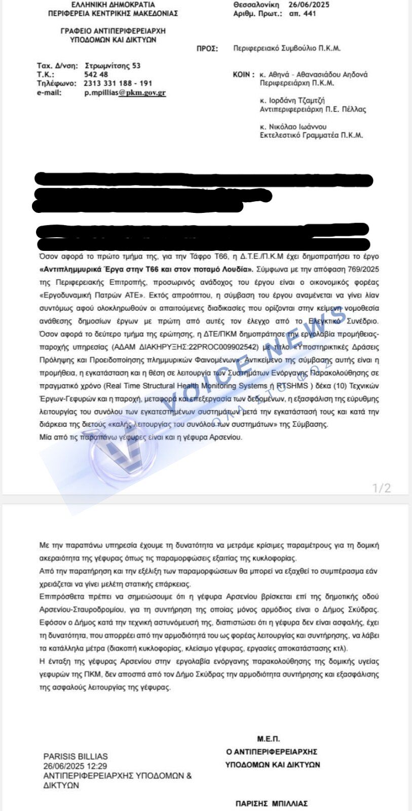 «Η καταγγελία έφτασε στο Voice News και είμαστε υποχρεωμένοι να τη φέρουμε στο φως, καθώς η υπόθεση της γέφυρας του Αρσενίου είναι ζήτημα ασφάλειας και βιοπορισμού των κατοίκων»