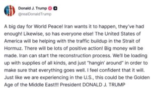 «Το Ιράν θέλει να συμβεί, έφτασαν στα όρια τους! Το ίδιο και όλοι οι άλλοι! Οι Ηνωμένες Πολιτείες Αμερικής θα βοηθήσουν με την αύξηση της κυκλοφορίας στα Στενά του Ορμούζ. Θα υπάρξουν πολλές θετικές δράσεις! Θα βγουν πολλά χρήματα. Το Ιράν μπορεί να ξεκινήσει τη διαδικασία ανοικοδόμησης. Θα φορτώνουμε προμήθειες κάθε είδους και απλώς θα “περιμένουμε” για να βεβαιωθούμε ότι όλα θα πάνε καλά. Είμαι βέβαιος ότι θα πάνε. Όπως ακριβώς βιώνουμε στις ΗΠΑ, αυτή θα μπορούσε να είναι η Χρυσή Εποχή της Μέσης Ανατολής!!!» έγραψε στο Truth Social.