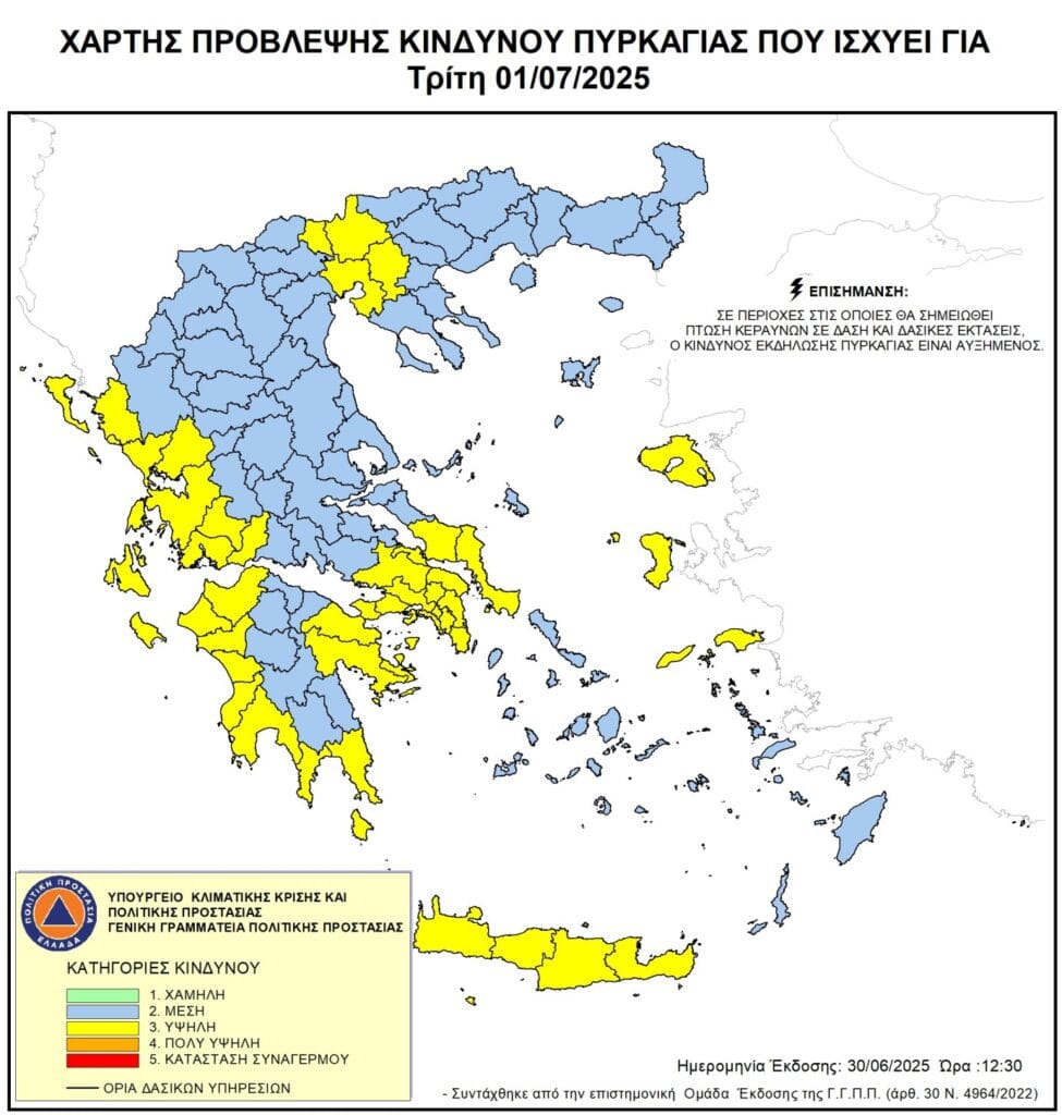 Η Γενική Γραμματεία Πολιτικής Προστασίας (civilprotection.gov.gr) του Υπουργείου Κλιματικής Κρίσης & Πολιτικής Προστασίας έχει ενημερώσει τις αρμόδιες υπηρεσιακά εμπλεκόμενες κρατικές υπηρεσίες, καθώς και τις Περιφέρειες και τους Δήμους των ανωτέρω περιοχών, ώστε να βρίσκονται σε αυξημένη ετοιμότητα πολιτικής προστασίας προκειμένου να αντιμετωπίσουν άμεσα τυχόν επεισόδια πυρκαγιών.